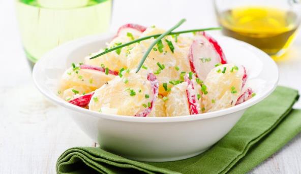 1. Obaren krompir i crni luk iseći na kolute, posoliti ih, preliti uljem, dodati na kolute sečene jabuke i kiseli krastavac.
