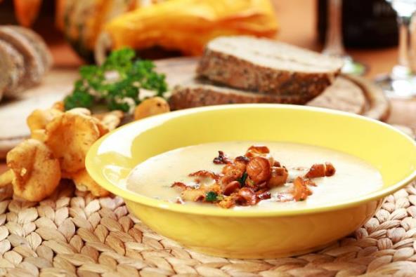 4. Izmiksujte čorbu štapnim mikserom, umiksujte sirni namaz, začinite solju i biberom, ukrasite za posluživanje pečurkama i začinskim biljem.