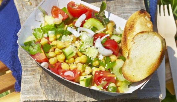 2. Iseckajte svo povrće i sjedinjite sa leblebijama. Pospite susamom i peršunom.