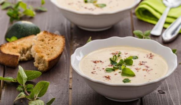 3. Kada je krompir skuvan, odstraniti lovorov list pa štapnim mikserom izmiksati. Dosuti jogurt i vodu tako da se dobije gusta struktura (krem supa).