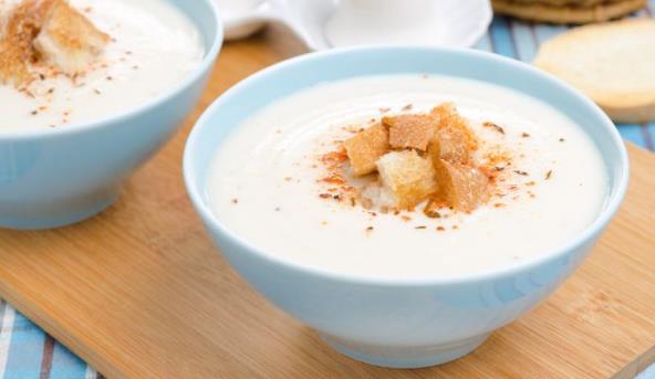 2. Hleb iseći na kockice i propržiti ih na vrelom maslacu. Čorbu servirati u činijice. Posuti seckanim timijanom. Dodati krutone.