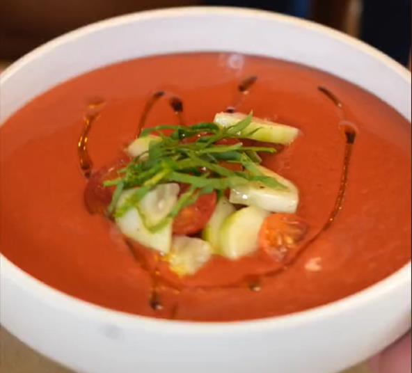 Isekcajte povrće i stavite u posudu. Dobro posolite, prelijte maslinovim uljem i sipajte malo sirćeta. Lepo promešajte, zatovrite i ostavite u frižideru preko noći. Ujutru lepo izblendirajte, da dobijete kašastu smesu. Ukrasite čeri paradajzom, krastavcem...
