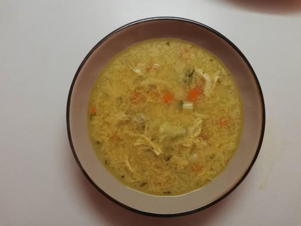 Piletinu stavite da se kuva, pa kad je gotova iscepkajte je i začinite suvim začinom. Vodu u kojoj se kuvala sačuvajte. U velikoj šerpi propržite crni luk, dodajte smrznuto povrće i sve prodinstajte 10ak minuta. Zatim dodajte meso i nalijte vodom u kom se kuvalo. po potrebi dodajte još obične vode. Poklopite i kuvajte dok povrće ne omekša. Dodajte biber i peršun. Umutite žumanca sa par kašika pavlake za kuvanje. Šerpu sklonite sa ringle pa sipajte žumanca. promešajte i vratite još kratko na riglu.