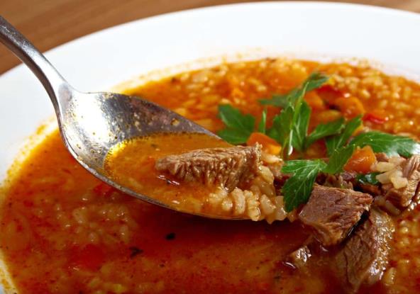 U šerpi propržite rendani crni luk, pa dodajte kosti. Prelijte vodom i ostavite da se kuva. Ako je potrebno posle nekog vremena dodajte još vode. Zatim dodajte seckanu vezu zeleni, sem peršuna, začinite suvim začinom, biberom, lovorovim listom i sipajte paradajz sos. Kuvajte dok šargarepa ne omekša, a ako je previše kisela dodajte kašičicu šećera. Pomešajte mlevenu papriku i brašno sa vodom, tako da nema grudvica i sipajte u čorbu. Dodajte i pirinač, sipajte čašu vode i kuvajte još 10 minuta. Na kraju izvadite meso i dodajte seckani peršun.