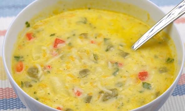 Crni luk presecite na pola i ispecite na ringli. Zatim u šerpu sipajte vodu i dodajte meso, pa kuvajte. Posolite, a onda dodajte i prepečeni luk. Očistite šargarepu i paškanat, pa dodajte u komadu u šerpu sa mesom. Kada povrće omekša i meso se skuva procedite supu. Dodajte u bistru supu sitno seckani krompir, grašak i pirinač koji ste prethodno oprali. Šargarepu takođe iseckajte, a ostalo povrće bacite. Meso ostavite na tanjiru da se prohladi. Promešajte i kuvajte dok sve povrće ne omekša. Kada se meso malo prohladi isecite i vratite u supu. Kada vidite da je krompir gotov napravite zapršku tako što ćete pomešati brašno i bujon (supu koju kuvate, uzmite oko 50 ml), pa dobro sjedinite da nema grudvica. Sipajte u supu i promešajte. Kuvajte još par minuta, pa ostavite da se prohladi. U prohlađenu supu dodajte umućeno žumance koje ste pomešali sa pavlakom za kuvanje i senfom, pa promešajte i služite.