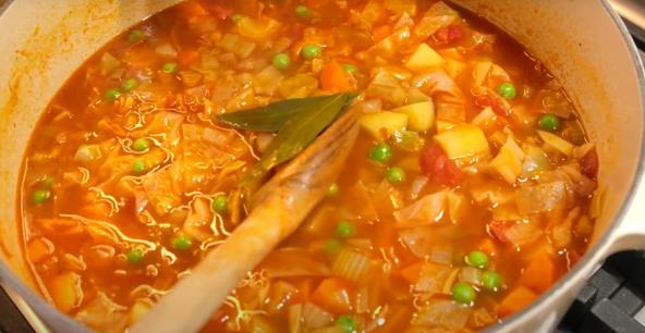 Dodajte krompir, kupus i lovorov list. Pojačajte vatru na srednju i dovedite čorbu do ključanja. Delimično pokrijte lonac poklopcem, a zatim smanjite vatru da održite lagano ključanje. Krčkajte 20 minuta ili dok krompir i ostalo povrće ne omekšaju. Dodajte smrznuti grašak i kuvajte još pet minuta. Sklonite lonac sa vatre i izvadite lovorovlist. Umešajte jabukovo sirće, začinite sa još soli, bibera ili sirćeta. Servirajte.