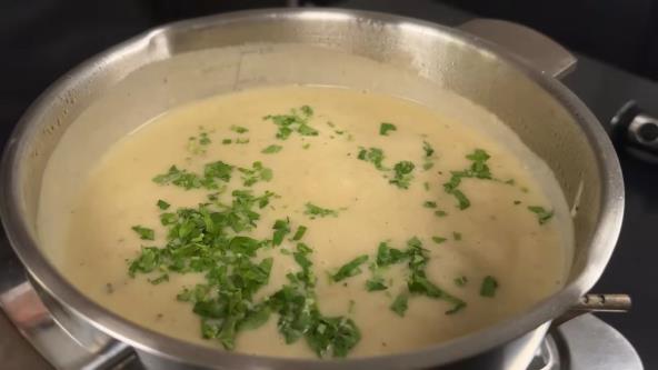 Sipajte vodu i kuvajte dok meso i povrće ne omekšaju (oko 30 minuta). Ubacite krompir sečen na kocke i kuvajte još 15 minuta, dok krompir ne bude skuvan. Umutite pavlaku sa malo supe i sipajte u lonac uz mešanje. Kuvajte još 5 minuta. Ukoliko želite umutite sve štapnim mikserom da dobijete krem čorbu. Na kraju dodajte seckani peršun i poslužite uz prepečeni hleb.