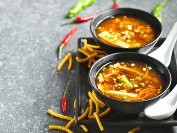 Sastojci: 1 crvena ljuta papričica, 1 kašičica rendane kore limuna, 3 cm korena svežeg đumbira, 1 šargarepa, 1 praziluk, 1 kašika susamovog ulja, 1 kašika pirinčanog sirćeta (ili belog vinskog), 1 l pilećeg bujona, 1 kašika gustina, 3 kašike soja sosa, malo bibera.