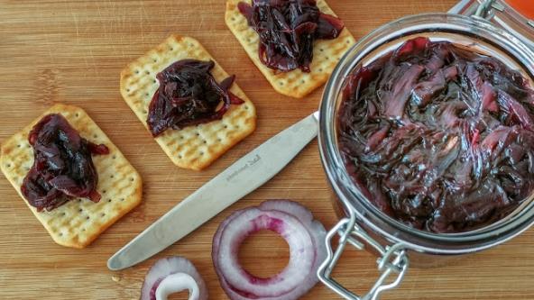 Isecite luk na rebra,pomešajte maslinovo ulje i puter, dodajte luk i dinstajete 15 minuta, dodajte zatim braon šećer, dinstajte još 15 minuta, dodajte balzamiko sirće, crveno vino, so i biber, i dinstajte oko 45 minuta, poslužite uz meso, ribu, krekere, bruskete....