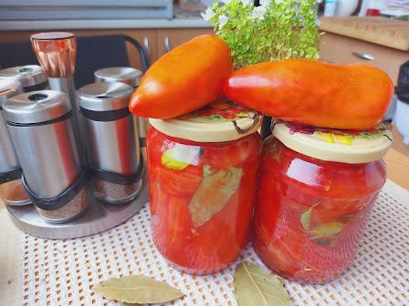 Paradajz (čeri veći) operite, pa zasecite vrhove u obliku krstića. U ključalu vodu spustite paradajz koliko stane. Pustite da vri minut, pa vadite u hladnu vodu. Skinite ljusku i odstranite dršku oštrim nožem u dubinu. Paradajz posolite i pošećerite, pa lagano promešajte rukama. Tegle dobro operite i sterilišite na 100°C, pa punite sa paradajzom, ali ne do vrha. U sredinu stavite listove bosiljka, biber i lovorov list. Pritisnite da paradajz pusti sok. Dobro zatvorite. Stavite u hladnu rernu, pa je uključite na 90°C 90 minuta. Ostavite da tegle prenoće u rerni, pa ujutru izvadite i ohladite. Ovako spremljen paradajz može stajati 2-3 godine.