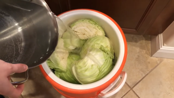 Zatim odaberite jednu veću posudu, na primer od 5 l. Sipajte u nju 5 l tople vode i 200 g soli. Mešajte dok se so skroz ne istopi. Dobićete 4% rastvor soli. Ako je posuda manje zapremine, količinu soli izračunajte prema količini vode. Sipajte dobijeni rastvor u bure. Ponavaljte sve dok se bure ne napuni vodom. U bure od 120 l sa 60 kg kupusa sipajte oko 65 l vode što zahteva 2,6 kg soli. Nemojte svu so odjednom da sipate u bure jer neće biti ujednačna slanost vode. Kupus je lakši od vode, pa zato pliva i iskače iznad površine vode. Pritisnite kupus sa 2 letvice, pa ukrstite i uglavite u ugao bureta.
