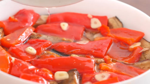 Za marinadu pomešajte ulje, šećer, so, sirće i biber. U marinadu dodajte sok od pečenih paprika, kada ih ogulite i ocedite. Isecite beli luk na tanke kriške. Stavite u činiju patlidžan, beli luk, paprike. Sipajte marinadu. Pokrijte i ostavite u frižideru najmanje 2 sata, lagano mešajući s vremena na vreme.