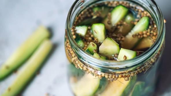 Isecite krastavac na kockice, kolutove ili štapićii stavite u teglu zajedno sa korijanderom, slačicom i mirođijom.