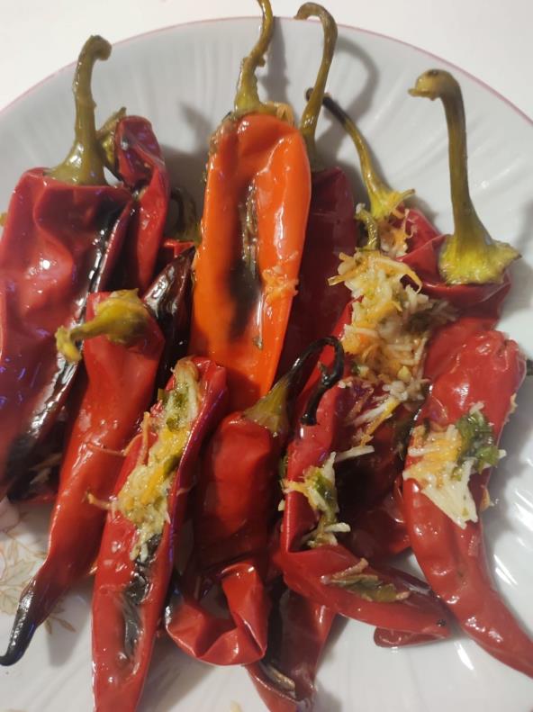 Ljute paprike operite i osušite, pa poređajte na pleh obložen pek papirom. Pecite ih na 200°C nekih 20-30 minuta. Držite ih u kesi par minuta, da se lakše oljušte. Skinite kožicu i posolite. Šargarepu izrendajte, pa dodajte seckani beli luk i peršun, pa pomešajte sa uljem i sirćetom. Prelijte paprike i ostavite malo da odstoje. Mogu da se jedu odmah, a možete da ih čuvate u zamrzivaču i da jedete kada god poželite. Jedino što u zamrzivaču čuvate samo pečene paprike, a preliv pravite naknadno.