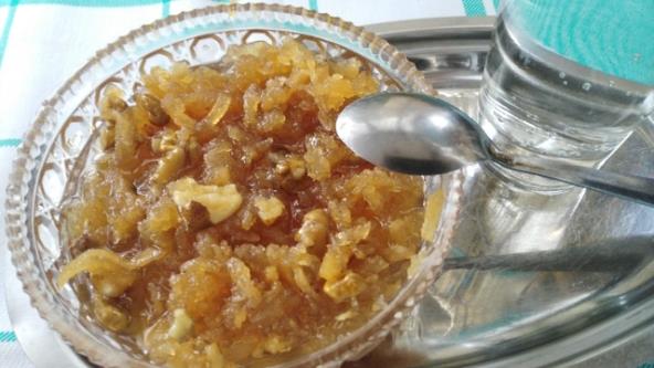 Kad se šećer ušpinuje (izlaze beli gusti mehurići) spustiti dunje limun na kolutove i orah i kuvati oko 30 min. Slatko je kuvano ako sa kašike sirup pada u gustim kapima.