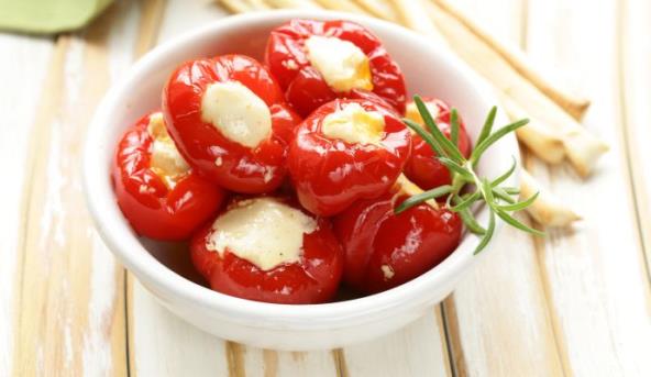 3. Mladi sir izdrobite viljuškom i po potrebi posolite, pa njime napunite paprike do pola i složite uspravno u posudu u kojoj će stajati.