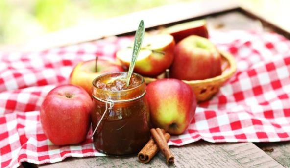 2. Pola litra vode i 1,5 kg šećera kuvati dok ne počne da se karamelizuje, onda dodati jabuke i suvo grožđe, i kuvati dok jabuke ne postanu providne.