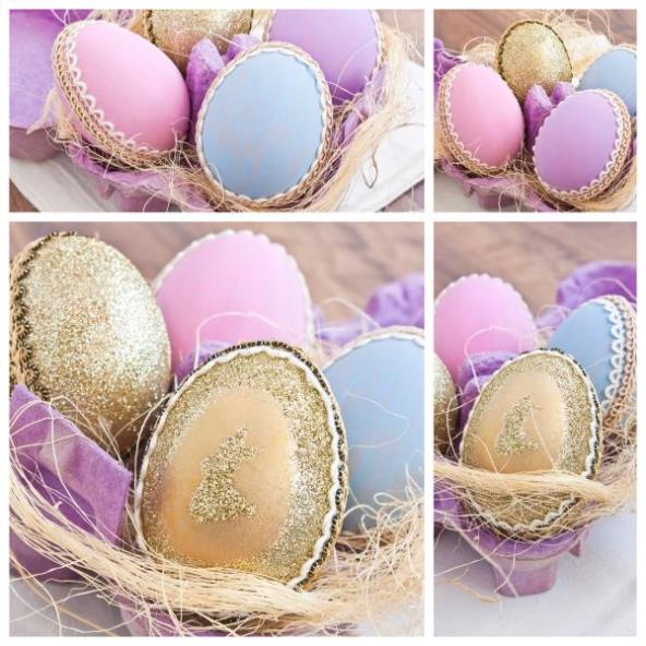 Za izradu ovih neobičnih uskršnjih jaja, potrebne su vam nežne, pastelne boje (roze, plava, žuta), tanja čipka (predlažemo zemljane tonove, od drap do zlatnobraon) koju možete da kupite na metar, šljokice u boji starog zlata, lepak i mali kalup u obliku zeke (nije neophodno).