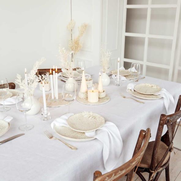 Za manje prostore: jednobojnost i jednostavnost. Jednobojan stolnjak, jednostavan geometrijski dizajn posuđa i čaša, escajg svedenog dizajna bez previše detalja, da biste postigli elegantan i svečan efekat vaše trpeze.