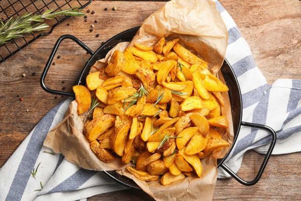 Krompir će biti hrskav ako ga isečete na kriške i pospete mešavinom koju napravite od po dve kašike kukuruznog brašna i palente i kašičice omiljenih začina poput mlevene paprike i kurkume. Stavite ih na rastopljenu mast u rernu i pecite na 200°C oko pola sata, pa promešajte i nastavite da pečete dok ne porumene.
