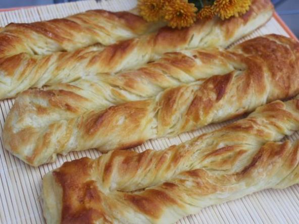 Razvuci testo da bude debljine 1cm. Isecite u obliku pravougaonika, veličina po želji. Nožem zaseći po sredini, jedan kraj provući kroz taj zaseceni deo. Premazati umućenim jajetom, posoliti i ostaviti još 20 minuta da narastu. Peći na 200 stepeni dok lepo ne porumene.
