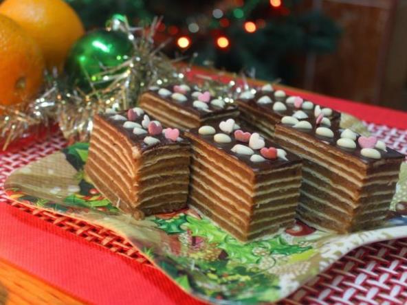 Pomorandže prethodno zamrznite i jednu sa korom, drugu bez, sitno narednati. Kuvati šećer sa vodom, da vri oko 3-5 minuta. Skloniti s vatre i u vruće dodati margarin i čokoladu. Mešati da se istopi, dodati orahe i keks. Izmešati pa dodati zamrznute pomorandže. Mlakom smesom filovati korice. Poslednju koricu ne mazati. Ostaviti da se stegne. Pritisnuti nečim teškim. Kad se ohladi izrezati kolačiće.