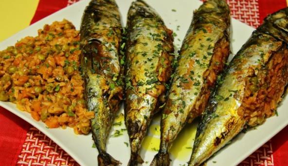 Izdinstajte iseckan luk na kockice, dodajte paradajz pelat, pirinač, grašak. Sve krčkajte oko 5 minuta, dodajte začin za ribu i suvi začin po ukusu. Ovim filom puniti ribu, staviti na foliju i isprskati limunom i maslinovim uljem. Umotati svaku ribu i peći na 200 stepeni oko 15 minuta, zatim raseći foliju da se riba još koji minut zapeče.