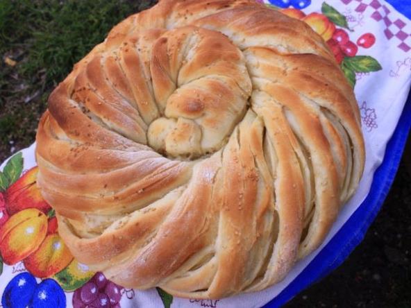 Zatim premesiti podeliti na tri jufke. Svaku jufku razviti u dužinu. Na prvu namazati omekšan margarin, zatim staviti drugu razvijenu jufku, premazati margarinom i odozgo staviti treću. Iseći trakice i uviti kao na video snimku. Oblikujte u krug i stavite da se peče na 200 stepeni oko 30 minuta ili dok lepo ne porumeni.