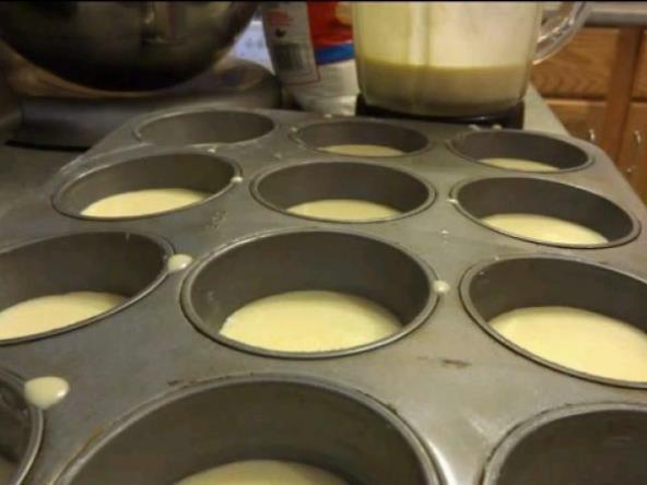 Kalupe za mafine namastite pa ih punite smesom za palačinke tako da ispunite ¼ kalupa. Pecite dok se palačinke ne naduvaju – oko 15 minuta.