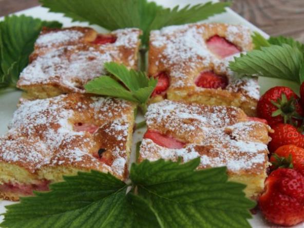 Imajte u vidu da je kolač sa voćem, pa nemojte čačkalicu ubosti blizu voća jer će na čačkalici ostati trag, a kolač vam je mozda već pečen. Prohlađen kolač secite na kocke i pospite šećerom u prahu i nafilujte šlagom.