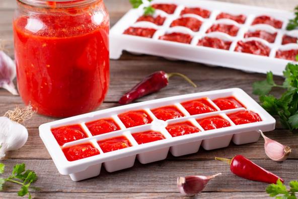 Smesu sipajte u plastične ili silikonske kalupe za zamrzavanje i ostavite jedan dan u zamrzivaču. Nakon zamrzavanja, dobićete kockice paradajz paste, koje se lako mogu izvaditi iz kalupa.