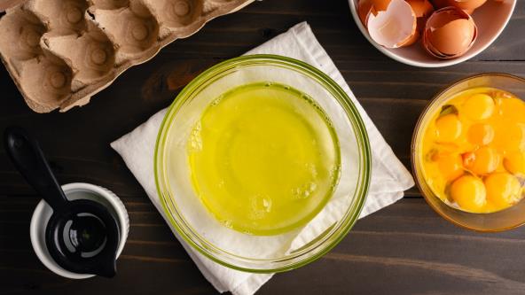 Pripremite dve manje činije – jednu za belanca, drugu za žumanca. Jaje lagano razbijte o ravnu površinu, poput radne ploče (ne o ivicu činije, jer tako lakše nastanu sitni komadi ljuske i možete probušiti žumance). Otvorite ljusku iznad činije i pustite da i belance i žumance iskliznu unutra.