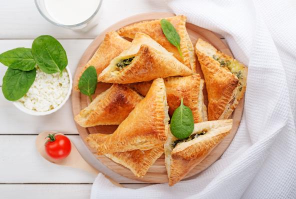 Da biste pripremili trouglaste pitice potrebne su vam kore za pitu i nadev koji može da bude drugačiji, zavisno koju pitu pravite. Za jedan trougao uzmite jednu koru za pitu. Rasprostrite je po radnoj površini i premažite je istopljenim maslacem. Nakon što ste malo premzali maslacem treba da je savijete u pravougaonik.