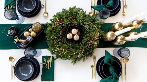 Novogodišnja zelena, zlatna i prirodna dekoracija stola