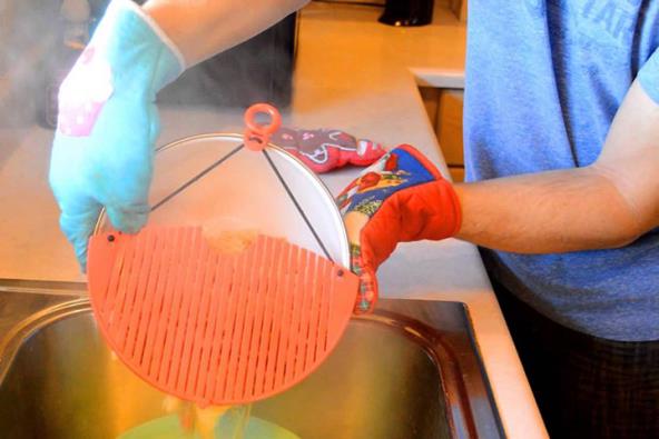 Bez prosipanja, bez lepljena hrane, Better strainer cediljka prilagodjava se svakom loncu,