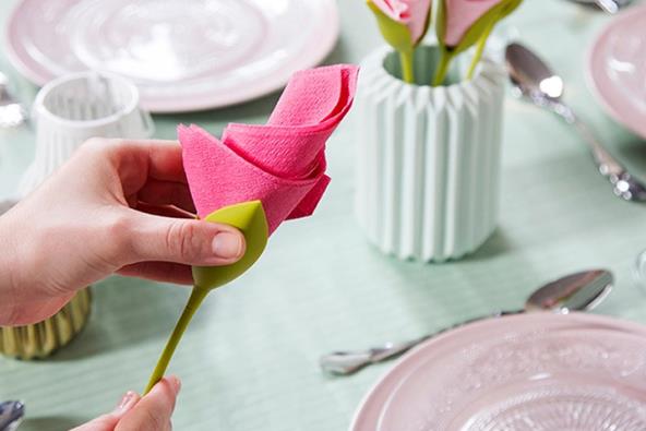 „Pravljenje“ ruže je ultralako: presavijete salvetu, ubacite je u držač i okrenete gornji deo držača na desno! I to je baš sve!