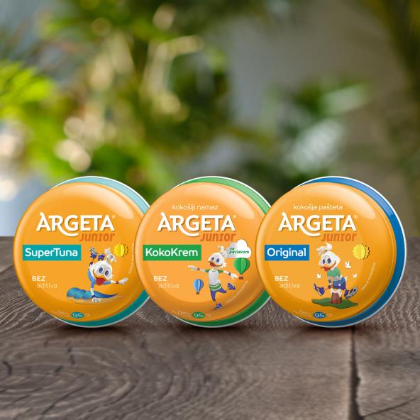 Dobro poznati ukusi Argeta junior namaza sada imaju unapređenu recepturu kojom je poboljšana nutritivna vrednost ali i novo, razigrano pakovanje. Avanture Junior Patka su oslikane na svakoj novoj 100% reciklabilnoj ambalaži Original, Koko Krem, Super Tuna i Krem Tuna namaza, koje sadrže manje soli i masnoća, a imaju visok sadržaj proteina.