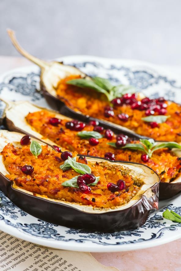 Polovine patlidžana isprati pod mlazom hladne vode da se ispere gorčina. Poređati polovine patlidžana jednu do druge, pa ih puniti smesom od preprženog povrća.
