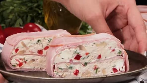 Posudu dimenzija 25x11 cm obložite providnom folijom. Posložite šunku tanko nasečenu po dnu i ivici, ali ostavite da malo viri. Pomešajte krem sir, majonez, seckanu papriku, pečurke, beli luk i peršun, pa pola smese sipajte preko šunke. Poređajte još jedan red šunke, preostalu smesu, a zatim zatvorite šunkom koja viri iz posude i stavite poslednji red šunke preko. Zatvorite providnom folijom i stavite u frižider na sat vremena.