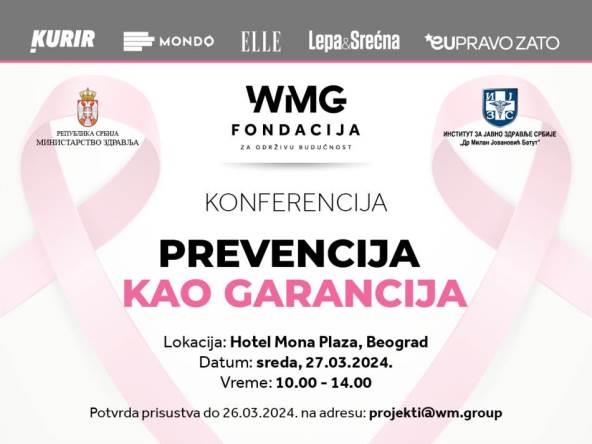 Konferenciju pod nazivom "Prevencija kao garancija" u kojoj će kroz tri panela eminentni stručnjaci govoriti o izazovima, dostignućima i perspektivama u prevenciji karcinoma dojke, kao i o putu od dijagnoze do terapije i značaju psihološke podrške, otvoriće ministarka zdravlja Danica Grujičić i direktorka WMG fondacije Irena Petrović.