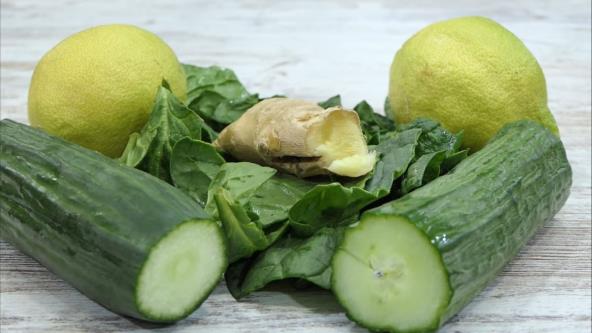 Sve sastojke dobro operite, potopite 20 minuta u hladnu vodu sa sodom bikarbonom. Zatim isperite hladnom vodom i osušite. Stavite spanać, krastavce i đumbir u blender. Dodajte mineralnu vodu i mutite. Dodajte limunov sok i procedite. Pijte 1 šoljicu uveče tokom 2 nedelje.