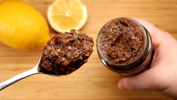 Sve sastojke usitnite u blenderu sem limunovog soka i korice. Njih dodajte na kraju i dobro promešajte. Sipajte u teglu.