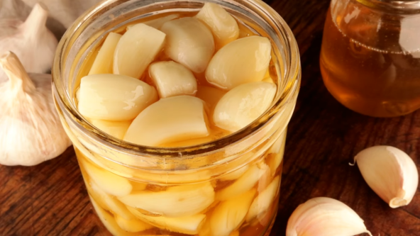Sipajte vodu u posudu i držite u frižideru (dobro je ohladite). Čenove belog luka skuvajte i onda odmah prebacite u ledenu vodu. Osušite čenove i stavite u sterilisanu teglu. Preko sipajte med.