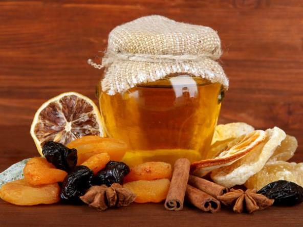 Sameljite suvo voće i limunovu koru (limunovu koru možete i narendati), izmešajte, dodajte konjak ili rakiju i med i ponovo izmešajte. Smesu prebacite u teglu i držite na suvom i tamnom mestu jedan do dva dana. Nakon toga, smesu čuvajte u frižideru. Uzimajte jednu kašiku pre obroka, najbolje pre doručka.