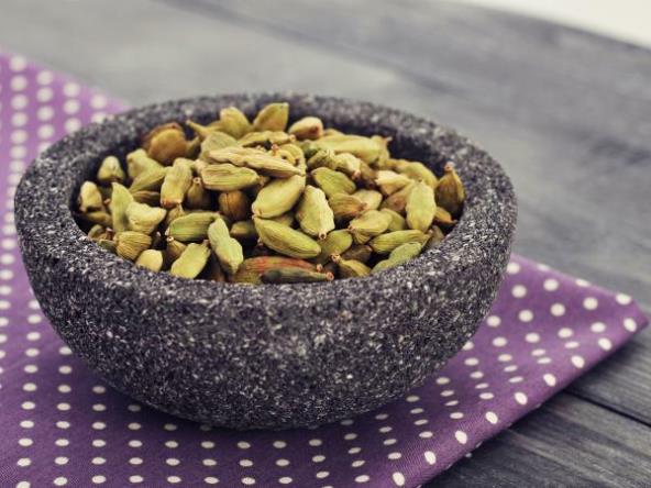 Kardamom u obliku praška, koji ukusom podseća na cimet, sadrži dosta jaka eterična ulja koja povoljno deluju: na uravnoteženje crevne flore tj. uništavanja bakterija truljenja (bakterostatik, antiseptik, antimikrobik), i sprečavanje nadutosti (karminativ), mučnina (naročito kod jutarnjih mučnina trudnica) i na pojačavanje probavljanja hrane u želucu (digestiv, podstiče razvoj bakterije vrenja).