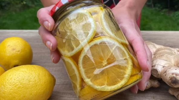 Limun potopite u vodu sa sodom bikarbonom, potom isperite hladnom vodom. Isecite ga na kolutove i odstranite semenke. Đumbir isecite na tanke kriške. Punite teglu naizmenično kolutovima limuna, đumbirom i medom. Zatim dobro zatvorite, okrenite naopako i ostavite 24 sata. Možete držati do dve nedelje na hladnom mestu.